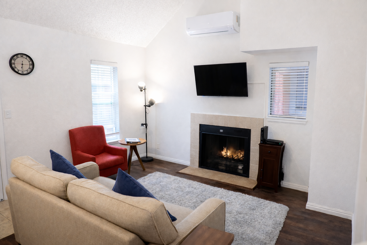 Snuggle up by the real fireplace! Just bring your own firewood and you’re all set.